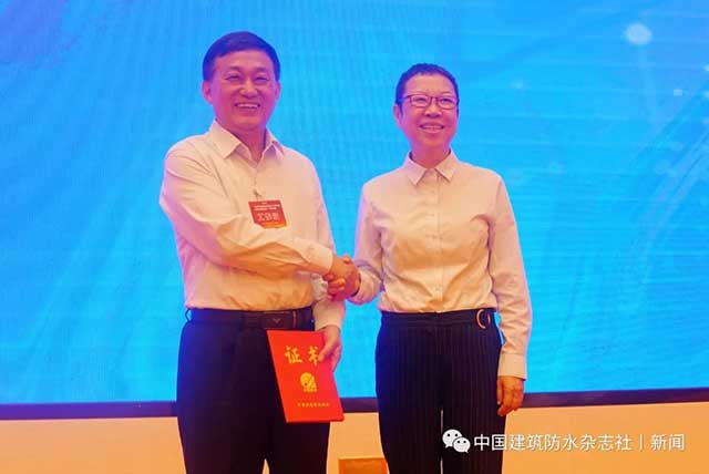中国建筑防水协会常务驻会副会长苗燕向胡希宝颁发瓦屋面分会副秘书长证书。