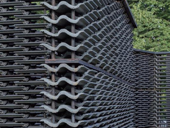 我们都知道,水泥瓦一般用作普通民房或者高档别墅的屋顶建设,但是设计师弗里达、埃斯科韦多设计的蛇形展亭,以水泥瓦建造,这种水泥瓦一般用于建造屋顶,颜色偏深而且具有独特的质感。展亭将水泥瓦以左右错位、类似植物的排列方式堆叠,形成带有墨西哥特色的镂空墙幕。展亭的庭院中还设一个三角形的水池,屋顶底下则以镜面铺就,在日光照射